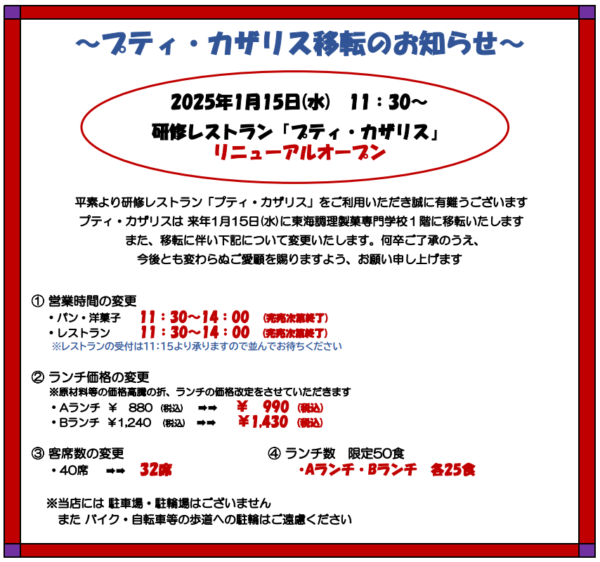 プティ・カザリスは 来年1月15日(水)に東海調理製菓専門学校1階に移転いたします。
