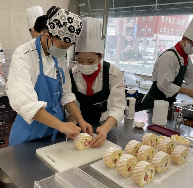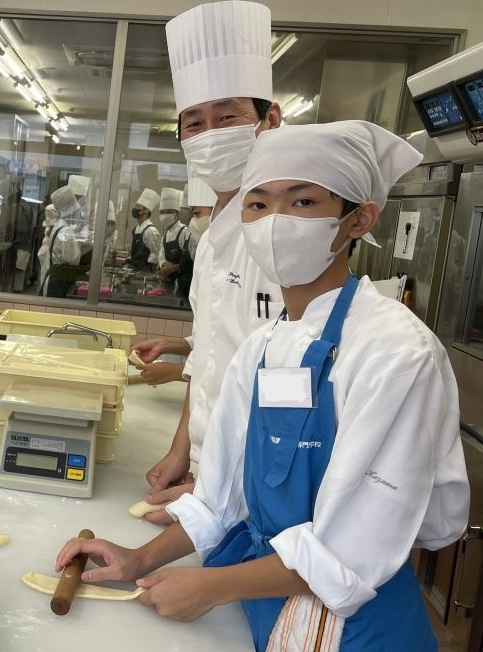 今回は製菓技術科2年生の学生とともに3名の生徒さんが、洋菓子・パンの製造体験を行いました。