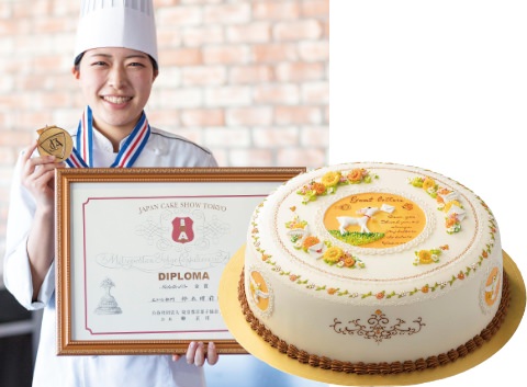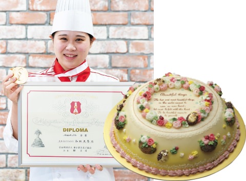 ジャパン・ケーキショーでは金賞をいただくことができ、本当にうれしかったです。なかなかデザインが思い浮かばず大変でしたが、先生方にアドバイスをいただきながら、最後まで粘ってデザインを考え、自分が「好きだ」と思える作品を作り上げることができました。支えてくれた先生、仲間、家族に感謝しながら、これからも技術向上を目指し、練習に励みます。