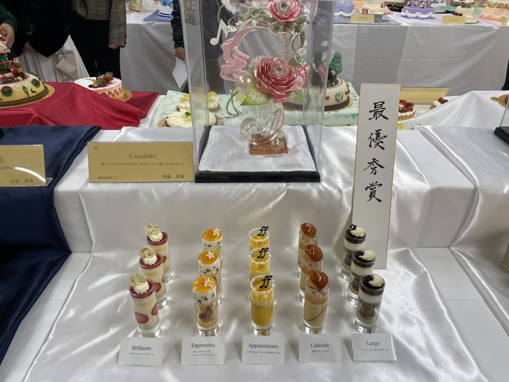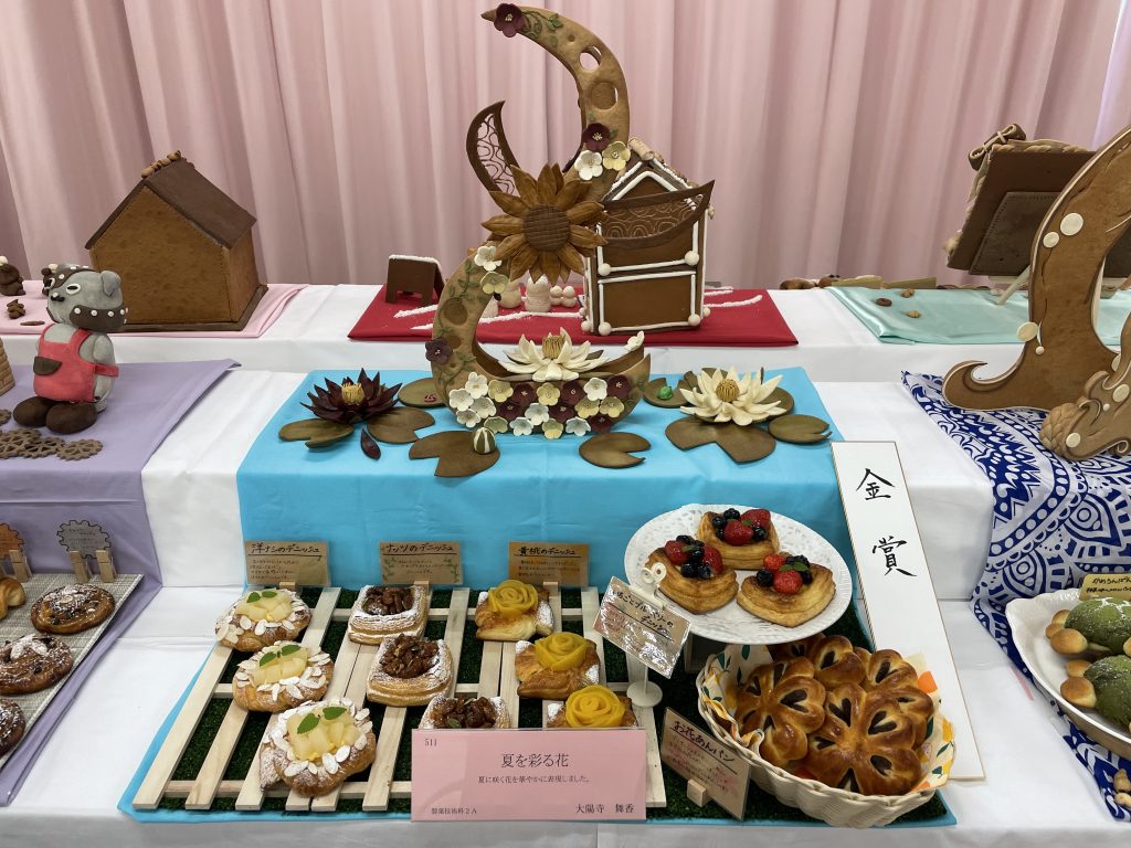 卒業年度生による調理と製菓の技術を競う、「料理製菓技術コンクール」では、学生達が心を込めて製作した作品がずらりと並びました。