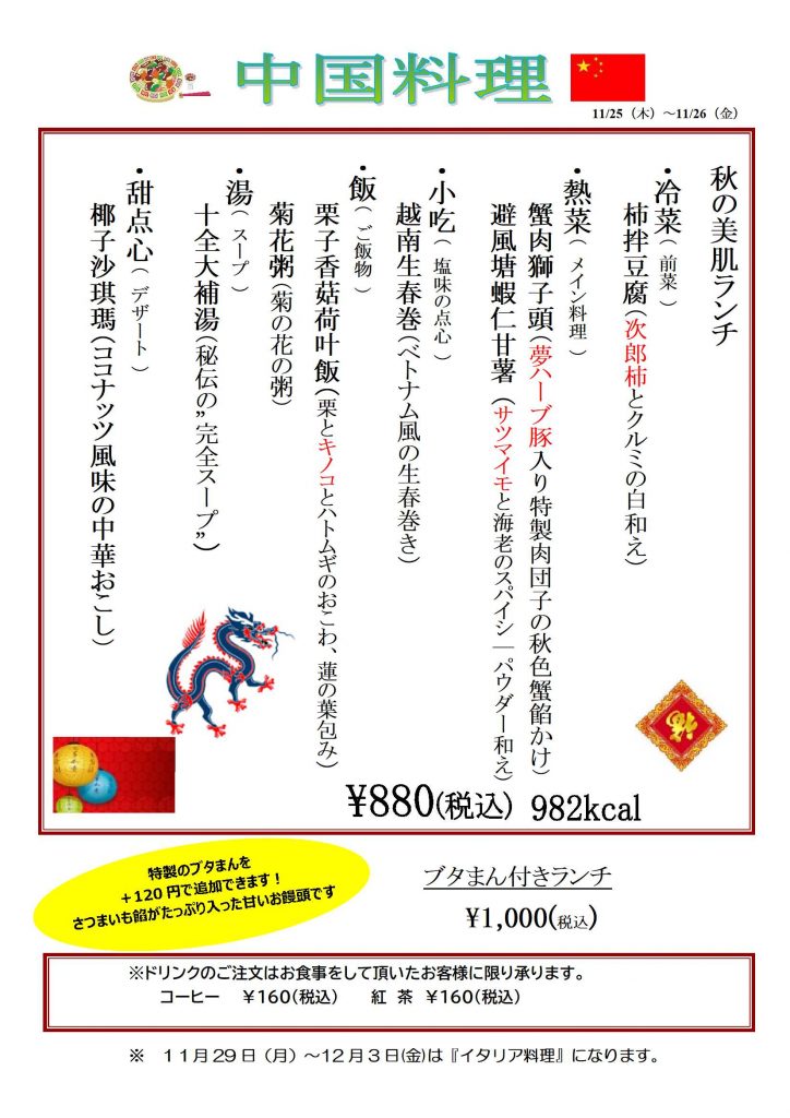 カザリス通信22 11月26日(金)のカザリスランチは中国料理