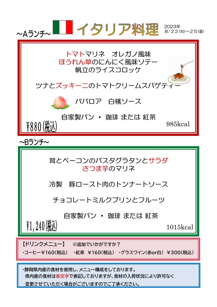 カザリス通信 8月22日(火)~8月25日(金)のカザリスランチはイタリア料理