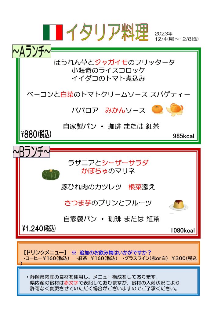 カザリス通信 12月4日(月)~12月8日(金)のカザリスランチはイタリア料理
