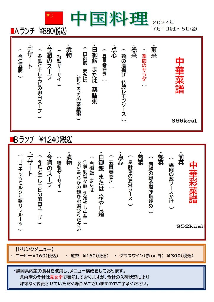 【カザリス通信】7月1日(月)~7月5日(金)のカザリスランチは中国料理