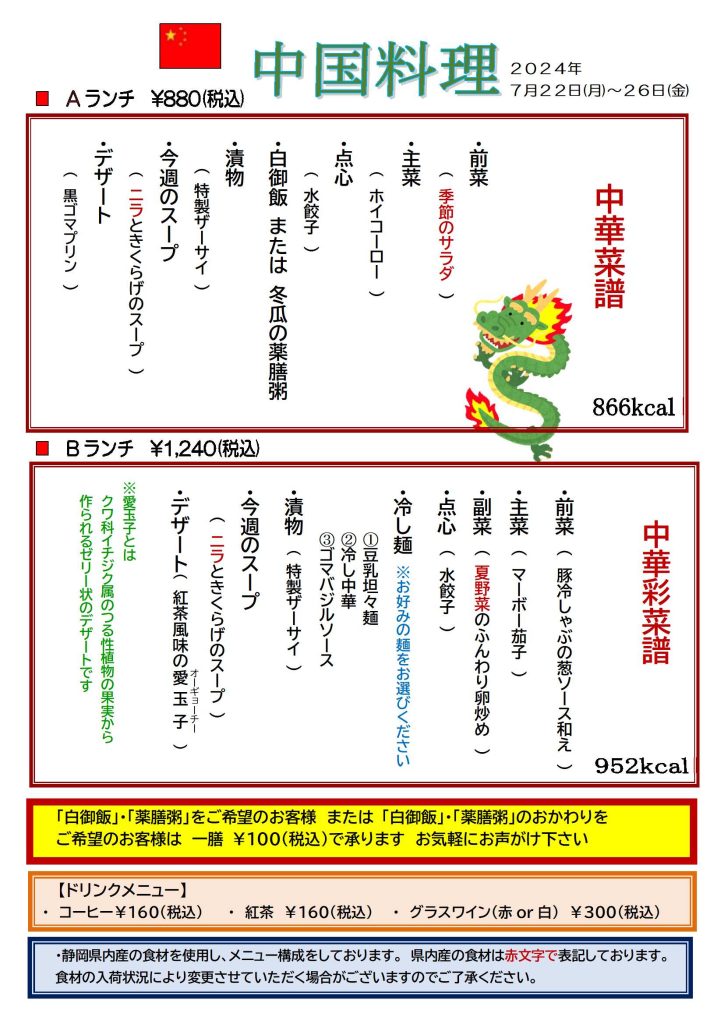 【カザリス通信】7月22日(月)~7月26日(金)のカザリスランチは中国料理