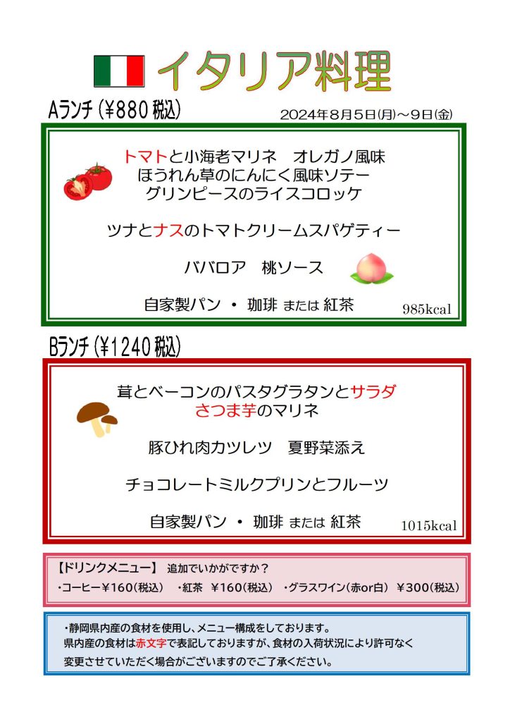 【カザリス通信】8月5日(月)~8月9日(金)のカザリスランチはイタリア料理