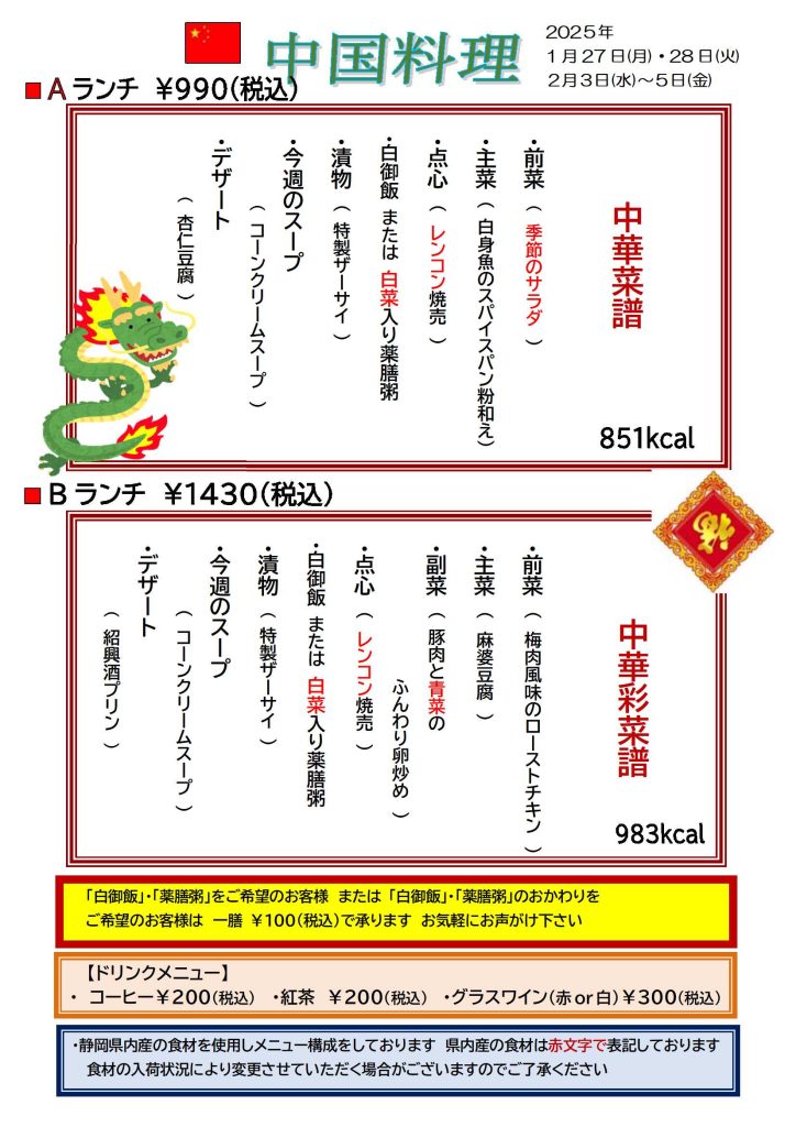 【カザリス通信】1月27日(月)、1月28日(火)のカザリスランチは中国料理
