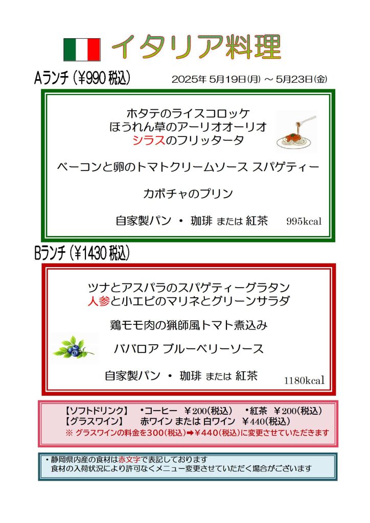 カザリス通信 5月19日(月)~5月23日(金)のカザリスランチはイタリア料理