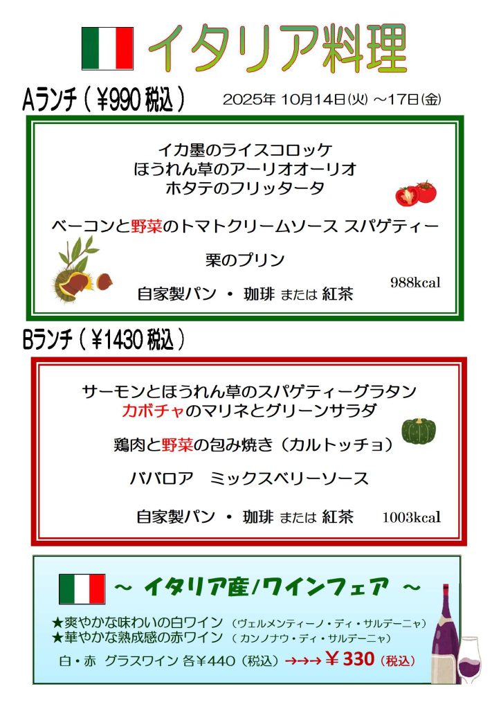 【カザリス通信】10月14日(火)~10月17日(金)のカザリスランチはイタリア料理