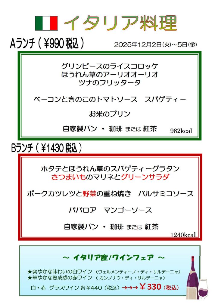 【カザリス通信】12月2日(火)~12月5日(金)のカザリスランチはイタリア料理