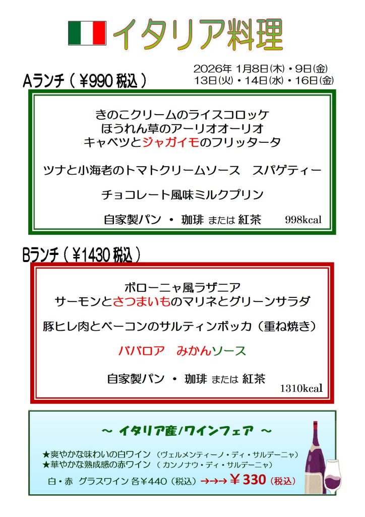 【カザリス通信】1月8日(木)~1月9日(金)、1月13日(火)~1月16日(金)のカザリスランチはイタリア料理