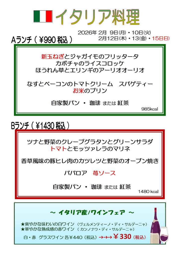 【カザリス通信】2月9日(月)~2月10日(火)、2/12(木)~2/13(金)、2/15(日)のカザリスランチはイタリア料理