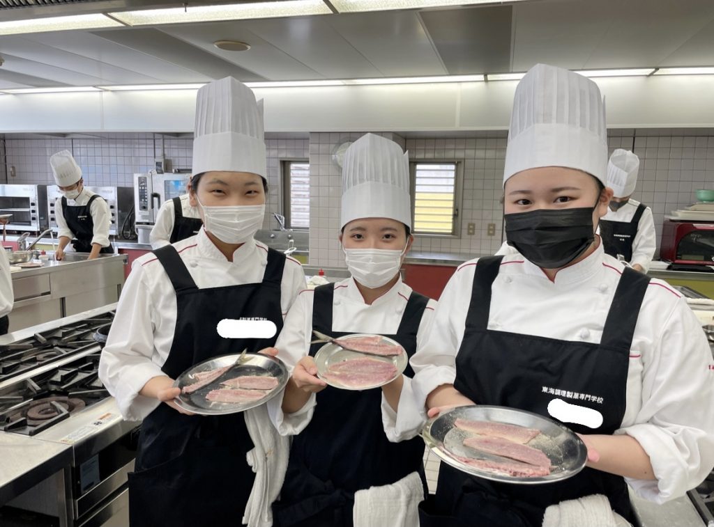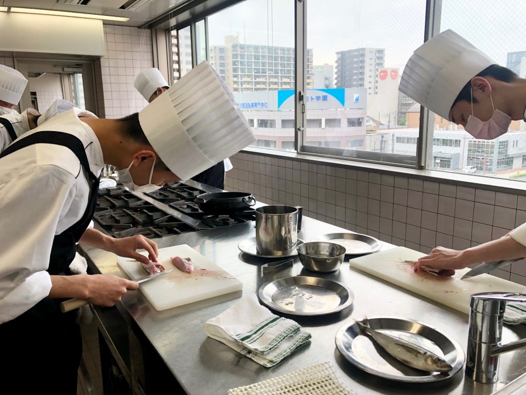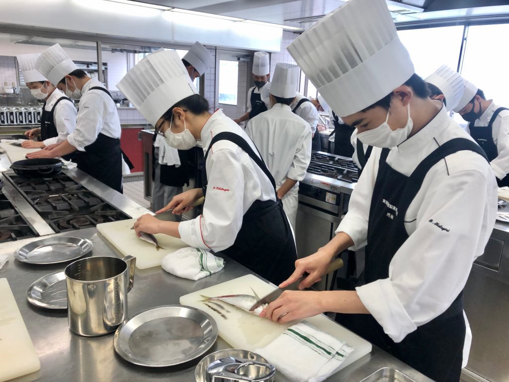 調理技術科1年生も、たくさん包丁研ぎの修業を経て、初めて魚をさばきました!!