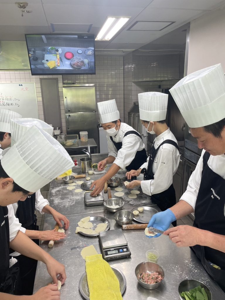 普段とは違う形の餃子を包むのに苦戦していますね、